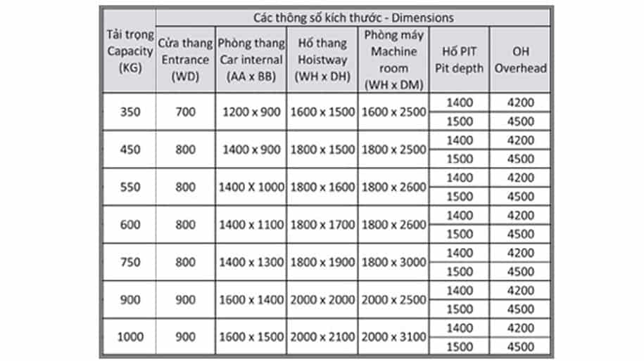 Ví dụ: Đối với tải trọng 300 kg(4 – 5 người), hố thang nhỏ nhất theo tiêu chuẩn là 1450(rộng) x1450(sâu) (mm), cửa thang rộng 650, cabin: 1050×850, động cơ Mitsubishi 3,7 KW (tùy vào chủ đầu tư lựa chọn loại động cơ).