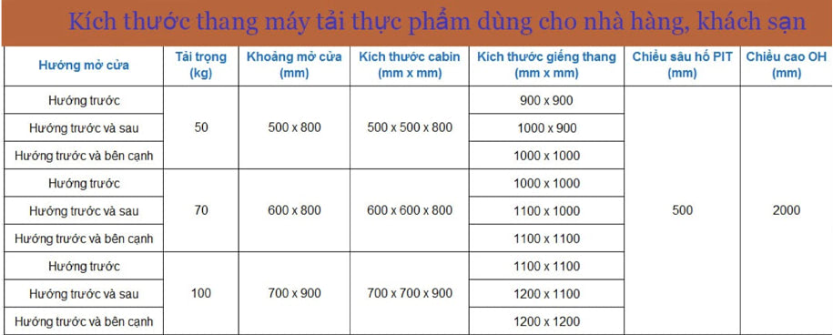 Kích thước thang tải thực phẩm dùng cho nhà hàng, khách sạn