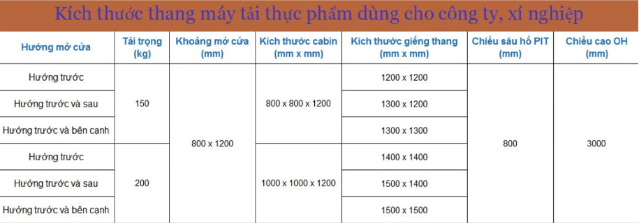 Kích thước thang tải thực phẩm dùng cho công ty, xí nghiệp